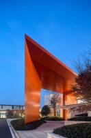 项目作为世界设计大会的永久会址,是工业设计重要的国际交流平台。通过贯穿整个片区的风雨连廊的设计,寓意工业设计的整合,国际交流的纽带,实现对人流的引导。而鲜明的橙色线条,与园区大面积立面元素相呼应,则为整个园区注入了活力。