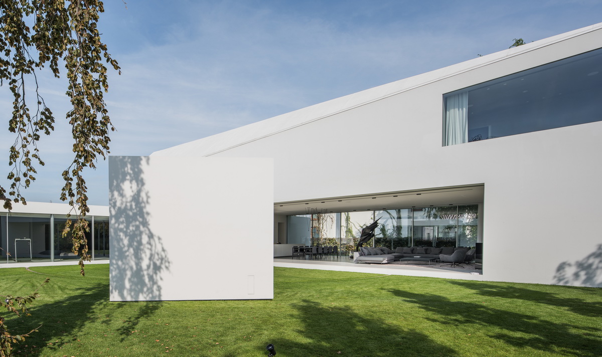 然后我们将底层的一部分旋转,以便在靠近道路的一侧获得尽可能多的私密空间。被“切割”的空间包含起居室和屋顶层,并向花园打开。在Living Garden House中可以找到类似的策略,即夜间活动区域在地板上,而日间区域成为花园的一部分。建筑与景观之间的界限被模糊化了。