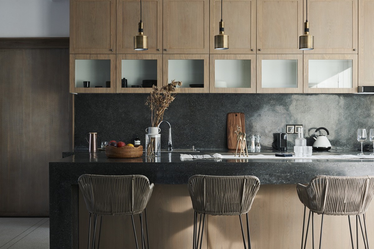 建筑主体大量使用本地材料,底层由室外延伸进入室内横砌的片岩板条尤为值得一提。我们还调适了多种本地工艺,从白色水磨石地面与厨房区域的深色水磨石,到浴缸周围的镶嵌磨平鹅卵石,最为复杂的工艺提升则是由木模板现浇混凝土构成的起伏凹凸立面。