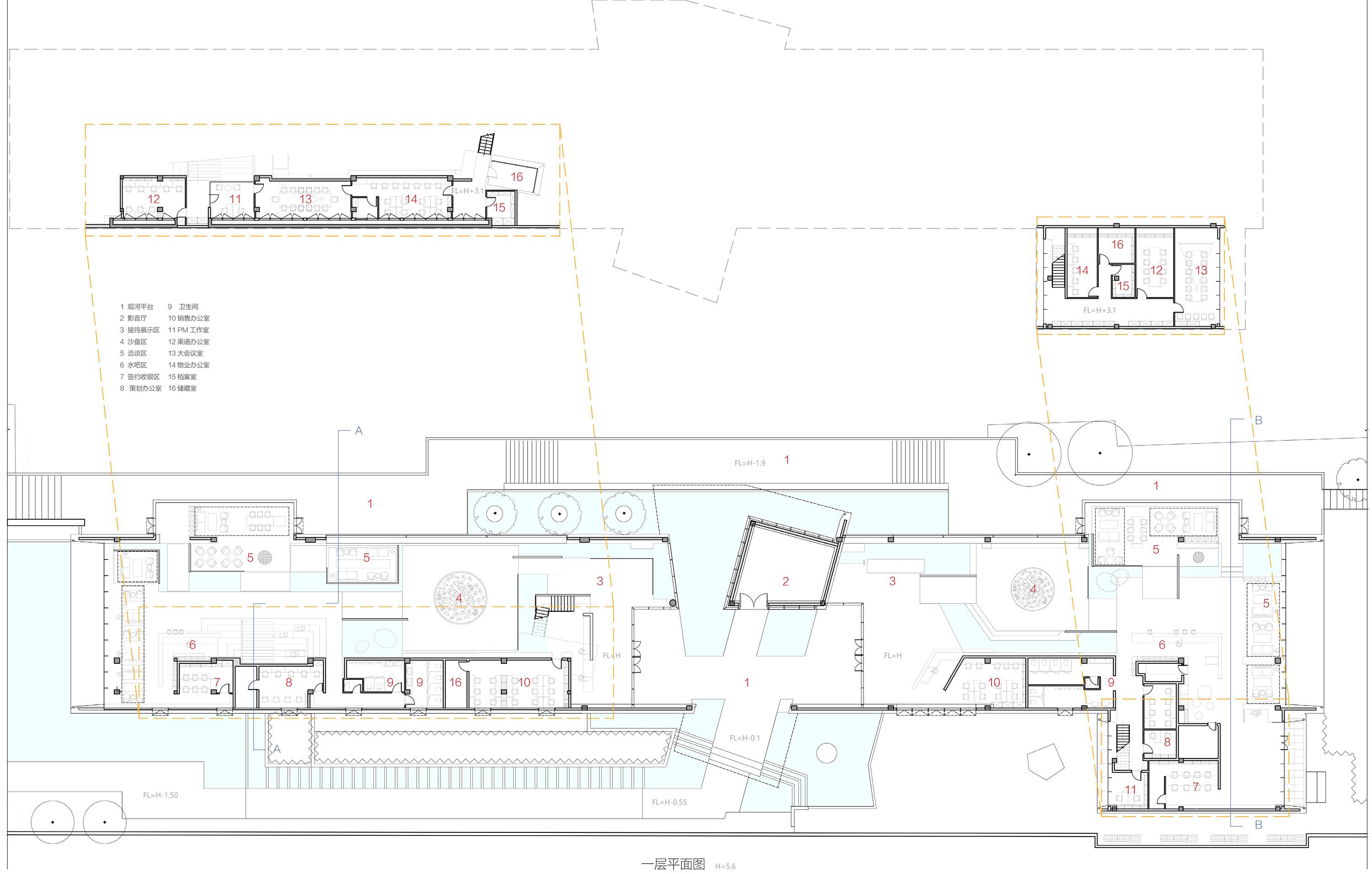 因基地狭长且共享入口,出于对人流动线的引导,加入交错坡屋顶体量,强化入口中心区域,并丰富建筑形态。坡道两侧密植修竹,与建筑格栅元素的光影婆娑交映,访客体验情绪铺垫后达成空间的转换,观览面向运河的开敞全景。两侧室内区域设置无边框长条宽荧幕大窗,将运河及对岸城市景观纳入框景,充分利用了运河资源。沿河展开的室内界面错落灵动,步移景异中可走出室外,深入贴近滨河场景。