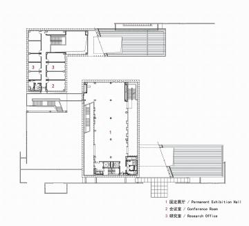访客经过建筑与片墙围合形成的东院进入博物馆一层,其整体塑造更偏向于现代几何的造园手法,西院以自然的“柔”对比呼应了东院现代的“刚”. 两个侧院分别为贵宾接待书房和多功能报告厅。