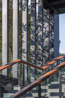 建筑师在喜马拉雅博物馆与研究中心材料类型、色彩和质感的选择上,延续了四川传统民居用材质朴的特点,建筑立面处理针对空间朝向的不同特性,被概括为两种模式——博物馆主体形态庄严稳重,立面设计更倾向于古城民居沿街立面虚实相生的构成手法;而面向景观庭院、对各层采光通风有更高要求的研究中心,则借鉴了古城民居落地花格木墙的通透性手法。