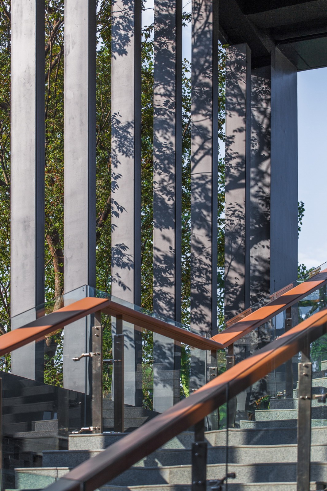 访客在博物馆内游览结束回到首层门厅后,可经由室外游园流线离开博物馆。连接博物馆与研究中心的天桥,不但实现了喜马拉雅研究中心工作人员与展厅之间的便捷联系,亦为人们提供了休闲及俯瞰整个庭院的场所。