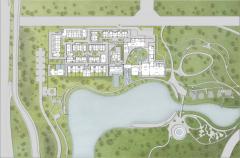 之于整个大的规划层面,设计利用沿高速路营造的山丘、高大的植被来隔绝外界的干扰,营造出一个静谧的整体内环境。再通过内部湖面的营造,以及北侧龙泉山脉,形成依山傍水的整体落位格局。