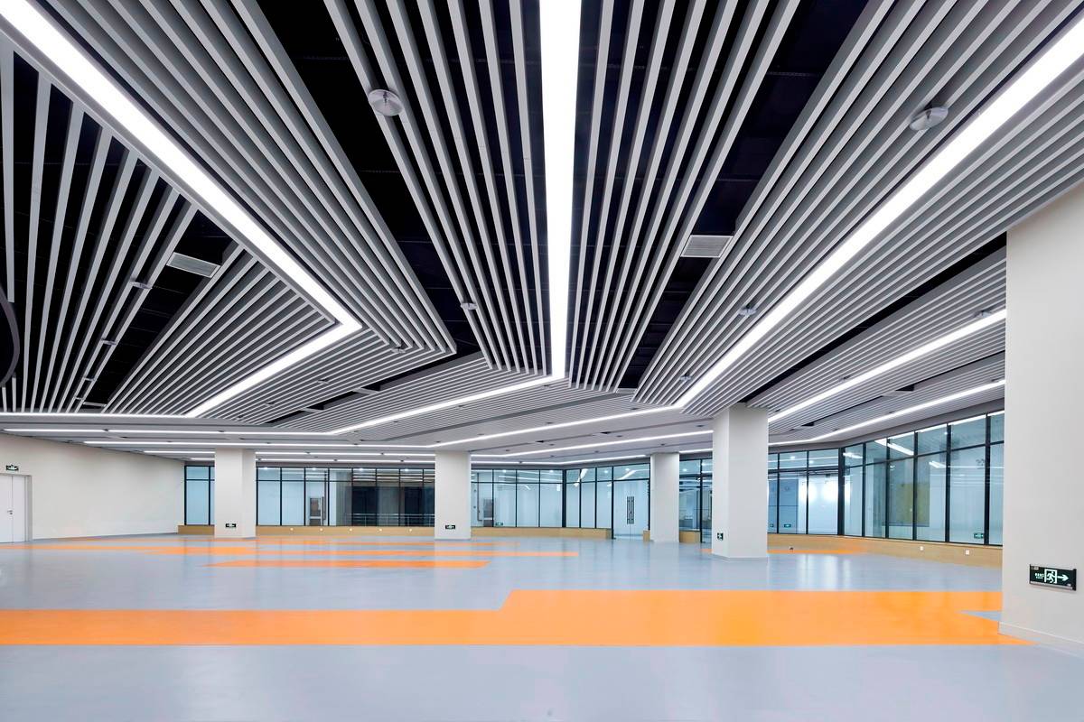 篮球馆与羽毛球馆的色调则定位在温暖、活泼、自然、运动,墙面采用木色吸音铝板,顶面采用了彩色渐变的三角形吸音体,使人见之就内心开怀,成为“一运动一解愁”的抒怀场所。