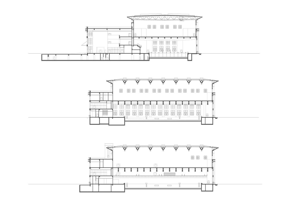 设计尽可能保留原有用地上的青草绿荫,将主要运动体量浓缩到最小,提高内部使用效率。同时,释放临湖空间,控制建筑面宽,消减建筑对湖畔景观的阻隔。建筑主体采用硬朗外廓,一方面利于功能高效布局,一方面便于辨识;形成两个长方形体量。连接两个体量则运用了两条优美自然的弧线,与长方体相互咬合,与室外广场、道路相互呼应,一气呵成,形成给人以亲切感的两个体育场馆入口空间。