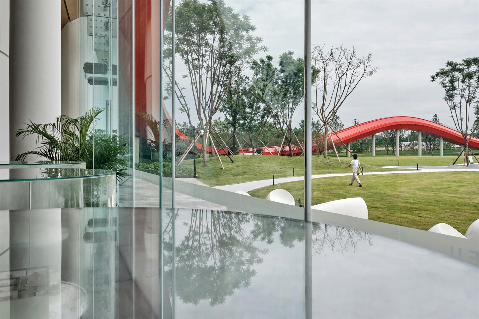 红色屋顶下,展览空间有着木纹天花板和开放的视野,结合周围景观,营造了温暖自然的氛围。外墙在结构上使用了玻璃肋增强结构强度,建造出了高达到13米的纯净的玻璃幕墙。这种高度透明感模糊了室内和室外之间的界限,再次增强了与绿色景观的联系。