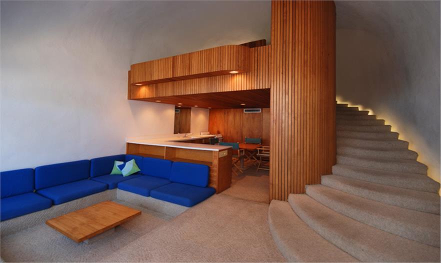 在1964年,飓风多拉在佛罗里达的一小块地产上造出一个沙丘。机缘巧合之下,沙丘落在了一个具有创造性的建筑师威廉•摩根所拥有的土地上。十年之后,威廉决定利用起这个自然元素。威廉想要建造成一个租赁房屋。他不要建造在沙丘之上,而是决定向下建造,所以沙丘房屋孕育而生。它是个两层的公寓套房,地下一层是生活空间,而第一层是卧室和盥洗室。这个沙丘房屋建于1975年,包括两个近乎相同的结构,共享一个普通的阶梯。每个结构有个750平方尺的空间。霍比特房屋成为租赁房屋,为那些想要在假期之间享受清闲时光的人提供了去处。在街上很难看到这座房屋,这个两层的公寓看起来像个大型的青蛙,因为它有两个大眼睛——窗户。房屋周围聚集的沙子让室内一年四季都是恒温,所以并不需要加热和制冷设备。室内是现代和中世纪复古元素的结合。主入口在第一层。起居室、厨房和座位区位于楼下,而一个玻璃墙让生活空间与院子和海景分离开来。沙丘房屋是使用游泳池技术建造的,用喷浆混凝土建造的外壳。室内大部分是木头建造的,包括里面的家具。
