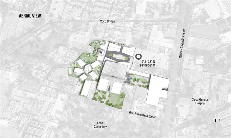 这个电影院占据墨西哥城国家电影资料馆和墨西哥电影学院的部分场地,周围绿荫茂密,建筑风光宜人,因此设计上将这个电影电视打造成为一个社会性的开放空间,具有浪漫的学院气息。电影院的场地曾在1982年发生了一场火灾,之后一直废弃,成为赶往地铁站和火车站的城市人群过境场地。新的设计将两个放映院呈单独体块布置,之间和地面层加上咖啡厅这样的公共活动营业场所,再使用一个80米×40米广场天棚将新建组与对面的老建筑联系起来。然后建筑师在场地中种上绿色植物,将服务空间布置在场地边侧,形成环境宜人的开放整体构架。天棚的材料是复合铝塑板,上面有不同大小的三角形穿孔。这个电影院除了建设放映大厅之外,还建有户外剧场,因此这里不再局限于放映电影,其边界拓展到戏剧、展览、音乐会等艺术内容。