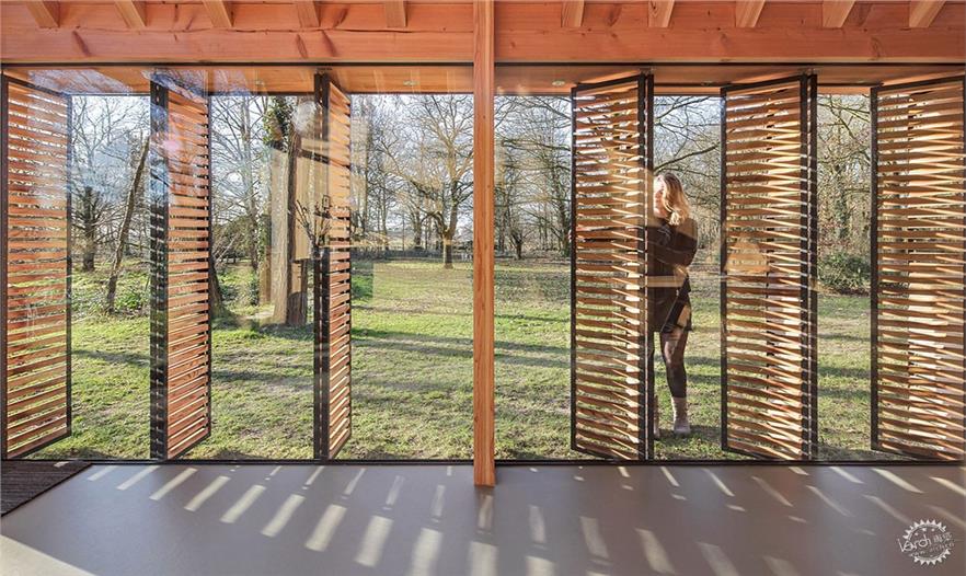 小屋的精致之处在于不对称的顶部设计、细节处理和室内设计。房屋一侧通过垂直镶嵌在表面的板条达到完全封闭。另一侧敞开向着绿地,装有活动百叶窗。阳光能直接照射进来,景色也能被尽收眼底。