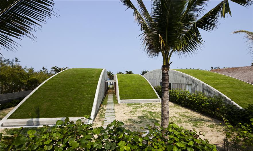 VIP沙滩别墅,位于海边,以不凡的方式规划。每个沙滩别墅都覆盖着不断起伏的绿色屋顶和竹子质感的墙面,鼓励通透的视线直接看向大海,遵循自然和游客的灵感。酒店建筑名为巴比伦是最高的建筑——三层的立面设计有散热孔,双层表皮,增加绿化的可用空间,形成一个绝对的绿色部分,代表了剩余的建筑。平房集群巧妙地结合其他四座楼,在狭窄的地块,每一边长都是21m长。这四座房子有一个公共的庭院,伴随着一个特定的庭院和水池。因此,大约全部平房的30%都由两层平房交替,在旧城区中创造了上下移动的房子的整体视图。