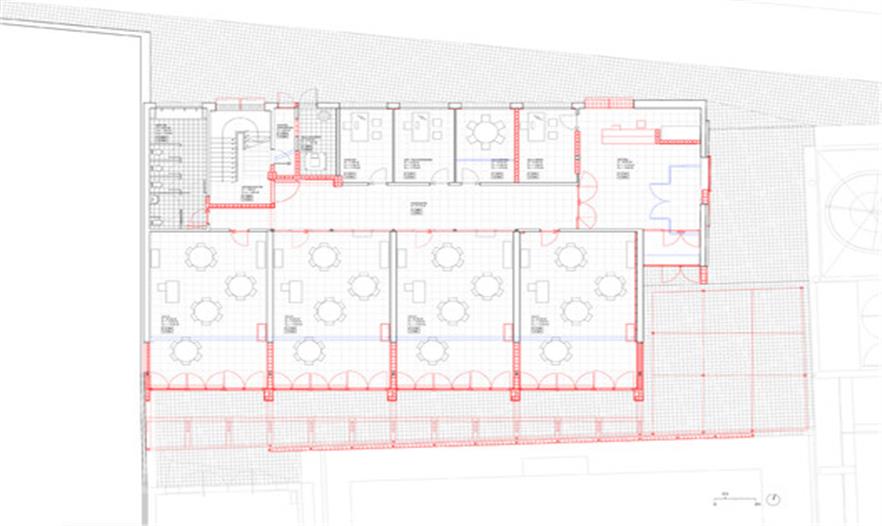 一半的南屋顶之前是不可以到达的,现在转换成一个新的户外操场,有着美丽的风景。翻新包含在一个附加的平面,位于完全保留的楼梯和一个钢筋混凝土板上。另一个新的庭院在体育中心楼梯下面,是为小孩子而设的。楼梯上的天窗有250平方米是用金属表皮覆盖的,由现有的梁所支撑。电梯的40平方米的混凝土屋顶——也成为一个基于沙地和看台之上的操场,孩子们可以在这里玩耍。
