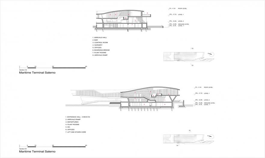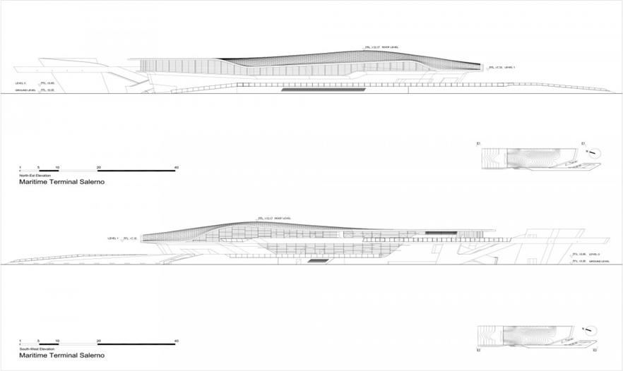 Zaha Hadid遗作萨勒诺海运码头在2016年4月25日落成,意大利总理马泰奥·伦齐对扎哈·哈迪德表示敬意。这座建筑是当地城市规划中不可或缺的一部分。当地的总体规划始于1993年,该建筑的设计权由Zaha Hadid在2000年赢得。新的萨勒诺海运码头建立了城市与海洋的新关联,牡蛎般流线柔软的形体上大下小,为游客在旅游旺季遮挡住炎炎夏日。建筑主要由三个部分有机组成,分别是:国家边境管理安检及航运公司的办公用地;国际渡轮码头;区域渡轮码头。到达码头需要经历一系列坡道,内部的餐厅喝休息室安置在游客必经之地。地方区域型的游客被快速引导至候船室。而国际游客则需要经过安检后访客到达侯客区。