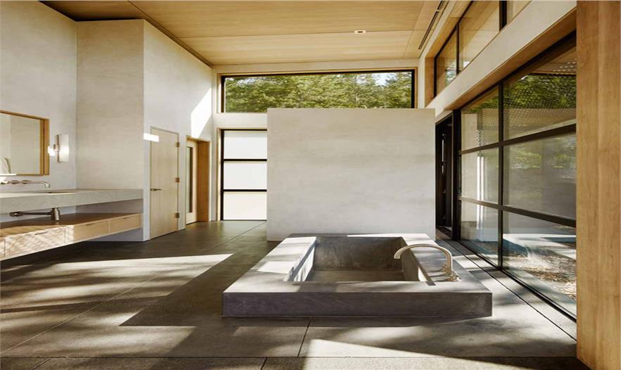 在卧室里还有另一个滑动门,打开就能进到外面的道路,能够观赏周围区域无比伦比的景色。浴室里还有一个木制折叠门,用于节省空间。混凝土地面从卧室一直持续到盥洗室。