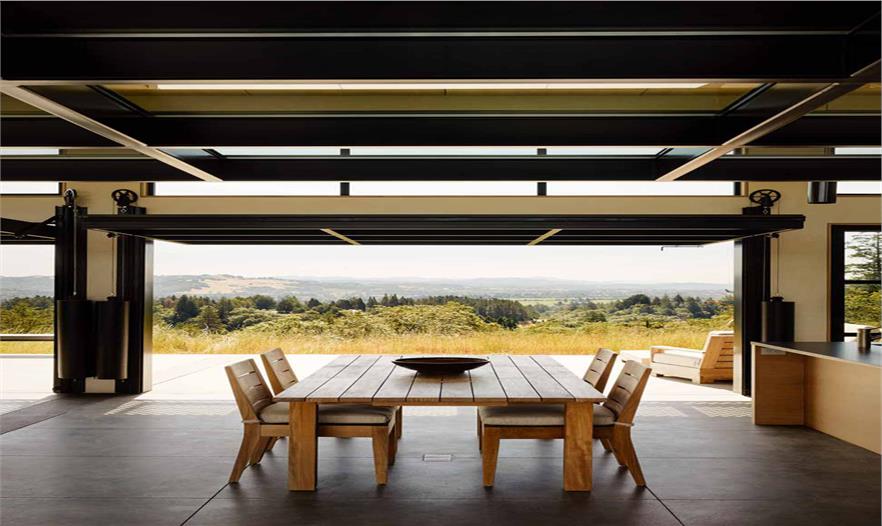 4个超大型、滑动玻璃板设在主起居室的每一边,营造戏剧化效果,室内外无缝连接,在热天有助于空气流通。简单的木制餐桌和椅子将厨房与起居空间分开。阳光透过高大的天花板和额外的窗户射入空间,而且木制厨房配有黑色木板,与窗棱相匹配。