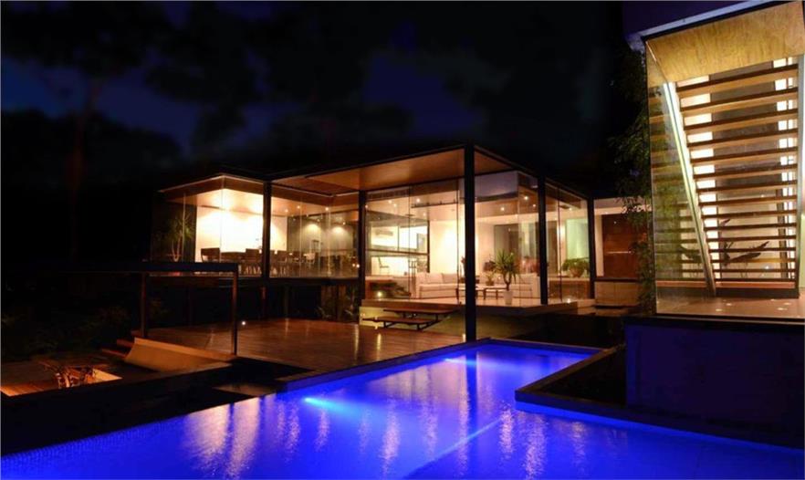 这个占地991平方米(1.0674万平方英尺)的住宅位于圣克鲁兹市独家封闭式社区内,要遮挡该区域的热带阳光,并利用这块倾斜的区域营造小尺度的氛围。其侧翼设计在现有树木周围,每个房间都能观赏到周围的绿景。