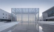 三座建筑的外墙材料分别采用关中传统的青砖、石材,以及玻璃幕墙。青砖墙面做凸凹肌理变化,玻璃幕墙采用开缝构造(形成灰空间避免能耗),强调两种不同时代材料的质感对比。青砖立面上有2cm,6cm和10cm三种凸出尺寸,以砖的光影变化为建筑增添生气。型钢的斜线手法实际是与文化行政中心区的大绿地肌理有所呼应,由墙面延伸下来和地面融合,与绿地景观形成一种同质关系。南立面窗檐部分进行多重的叠涩处理,延续关中传统建筑的特质。建筑的场地规整,通过不规则的地景和水池设计,以及丰富的建筑形体关系和表皮肌理,活化并激发出独特的场所氛围。