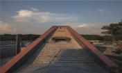 JPN 博物馆以一个楔形形状矗立在场地中央,在他的外墙上有一个巨大的拱形门;它高9米,跨度为20米,这也是在设计上能够达到的极限值。沿屋顶上的台阶就可以进入到展厅内部,而在屋顶上则能够俯瞰 R.M. Lohia 公园的全景和会议中心。