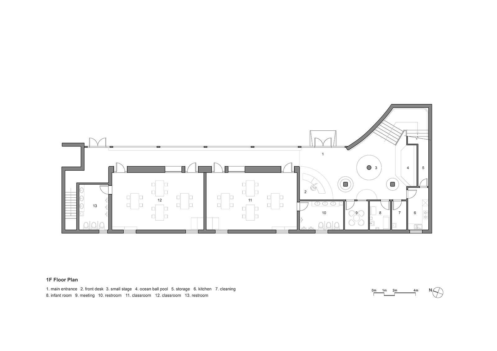 相比于教室内的教学空间,教室外的走道因其良好视野和公共属性,更适合作为释放儿童探索天性的舞台。于是我们先对调了二楼的教室和走道,消灭了无采光的消极空间。