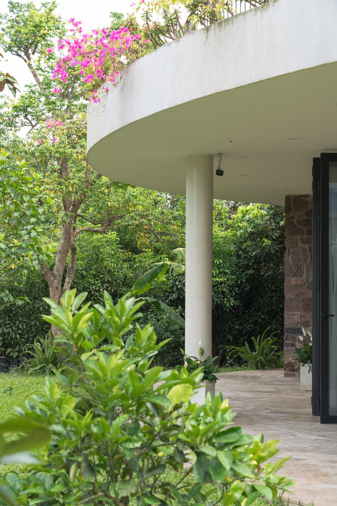 主建筑是一个巨大的椭圆形,像一个天穹覆盖着整个房子,其在太阳光线中落下来的影子就是天然的时钟。这座“天穹”是由4个代表东、西、南、北的实心石墙组成的空间,由私密向公共属性过渡。特别是椭圆形体量四周的屋檐设计模仿了古代越南房子特有的屋檐形式。这样的空间能够将人类使用的内部空间过渡向外部的自然环境,也就是房子内各种活动发生的地方。住宅的核心空间充满了哲学意味,那里放了一块坚固的岩石来提醒家庭成员要彼此团结,相互依赖。