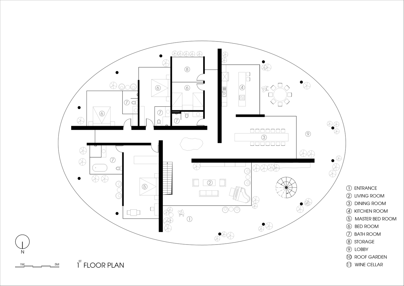 如果从上帝视角俯视整座住宅,可以看到这个巨大的椭圆形体量仿佛是一个带有人间“伊甸园”的微缩地景,这样的屋顶花园正是人们梦寐以求的乐土。这个独特的花园不仅是孩子们在梦幻般的天空中仰望星空的地方,也是整个夏季的聚会和欢乐趴场所。