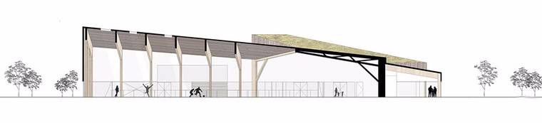 该建筑全天开放,为学校课程或当地体育俱乐部提供场地,可用于举办各种活动。建筑由三个体量组合而成,三个体量的中心相互连接,形成断裂的形台,可以清楚区分不同的功能区域。建筑内部空间大面积开放,因此可以灵活使用。三种体量中只有一个与室内其余部分分开,同时这个空间也具有相应的隐私保障与隔音设施。这个封闭的房间也具有隔热的效果,可用作会议室或咖啡厅,或作为舞蹈、瑜伽、武术和其他小型活动的工作室。主要的多功能空间面积宽敞,可用于团队运动,如篮球或足球。另外,这里还可以举办跳蚤市场等社区活动。