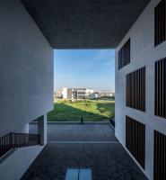 由此形成张弛有致的建筑空间:从入口大厅进入由报告厅围合呈横向展开的一层院子;报告厅的厚实外墙如传统照壁般阻隔着视线,一侧的室外台阶暗示着院子在竖向和纵向两个维度上的延展;