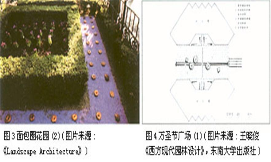 美国景观设计领域对后现代主义的探索首先是从小尺度场所开始的。1980 年美国著名景观建筑师玛莎·苏瓦兹(martha Schwartz))[3]在《景观建筑》杂志第一期上发表的面包圈花园(Bagel Garden),在美国景观设计领域引起了对后现代主义的广泛讨论,它被认为是美国景观建筑师在现代景观设计中进行后现代主义尝试的第一例(图2、图3)。面包圈花园坐落在波士顿一个叫Back Bay的地区,在那里每条狭长街道两边排列的都是可爱的低层砖房,它们集中了过去各个历史时期的建筑风格,而且每栋建筑前都带有一个临街的、开敞式的庭院。面包圈花 园是个小尺度的宅前庭院,用地范围22×22英尺,面朝北方。花园空间被高度为 16英寸的绿篱分割成意大利式的同心矩形构图,两个矩形之间铺着宽度为30英尺宽的紫色沙砾,上面排列着96个不受气候影响的面包圈。小的矩形内以5×6的行列式种植着30株月季。场地中还保留了象征历史意义的两棵紫杉、一棵日本枫树、铁栏杆和石头边界。在设计中,苏瓦兹想创造的是一种“既幽默又有艺术严肃性的”[4]场所感。这个设计的最大特点就是把象征傲慢和高贵的几何形式和象征家庭式温馨和民主的面包圈并置在一个空间里所产生的矛盾;以及黄色的面包圈和紫色的沙砾所产生的强烈视觉对比。这个迷你型的庭院以具有历史风格的花篱、紫色的沙砾、以及隐喻Back Bay地区象兵营式排列的邻里文脉的面包圈,构成了后现代主义思想缩影。这个花园为人们开启了一扇小尺度景观设计的新视野——就是把传统的、有限的景观想象和新概念结合起来,创造出新景观。从而使这个迷你型的花园在学术性及艺术文脉两方面成为新设计的导向。