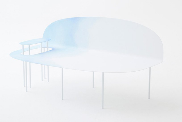 这一系列产品的灵感来自颜料浸染纸张的效果,设计师也巧妙地将造型设计成被人手剪切或折叠的纸张, 一种微妙的蓝色在桌子和椅子上流淌,就好像它们浸在水彩中一样,形成完全模糊的图案和表情。而令你大吃一惊的是,它们却是用硬邦邦没有温度的金属制作的!