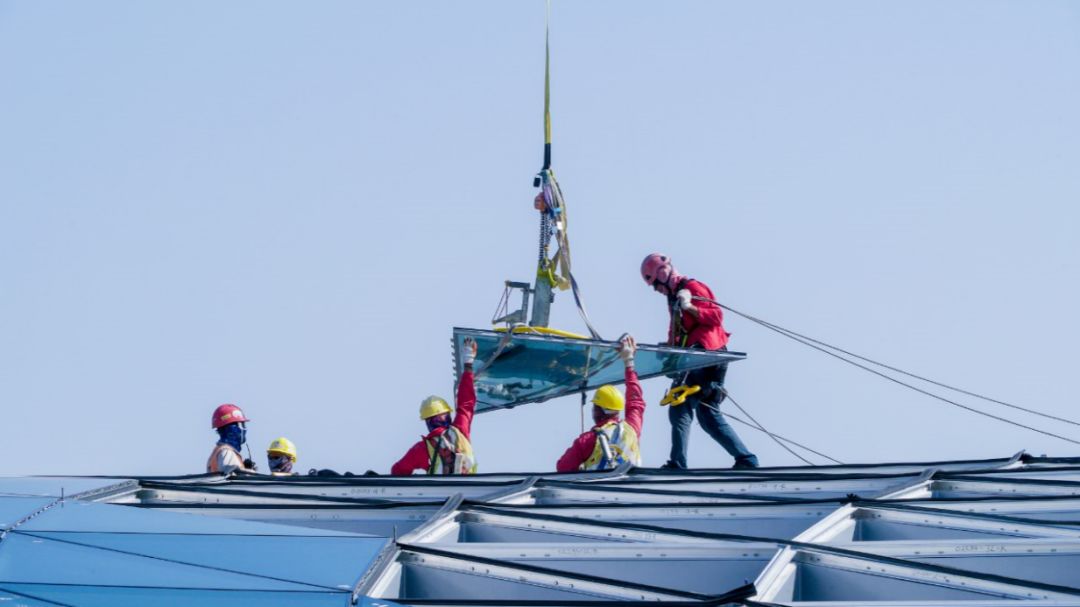 确认没有问题后,才使用液压泵和起重机将重达300公斤的玻璃安装到特定位置上。