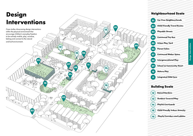 从建筑环境的角度来看,导致儿童在社区内游戏空间减少的最大障碍之一就是增加的车流量和社区内适合玩耍的非正式空间的减少。汽车在如今社区当中的主导地位对儿童的活动力产生了特别大的影响:减少了他们安全玩耍、社交和独立感知社区的机会。传统上被孩子们用来玩耍的空间,譬如街道、车道或空地,在不断的减少,而这是因为不断增加的交通量、停车需求以及更高的土地价值而造成的。随着我们的城市不断地增加人口密度,开放空间变得越来越有价值,更加重要的是在规划政策中优先考虑儿童户外活动和出行,以确保每个孩子都可以在自己的门阶上自由游玩,步行以及骑自行车去学校。这里有几个例子表明城市一些是非常认真地对待这一责任的。