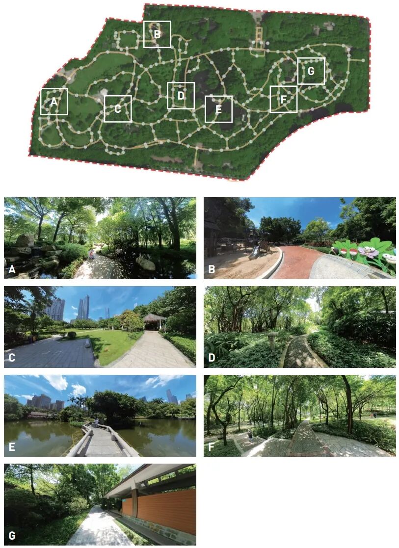 珠江公园主、客观指标的得分的空间分布模式较为相似。公园西门入口前的草坪区(C区)主要由开阔的草坪与低矮的乔木组成,辅以少量灌木,整体空间较为开阔、道路较为宽敞,天空占比较高,绿视率与自然程度较低,同时吸引力偏低。公园中部的快绿湖区域(E区),虽然绿视率较低、天空占比较高,但吸引力较高,符合人们对水体有普遍偏好的既有研究发现。公园东部为植被茂盛的风景林区(F区),绿视率与自然程度较高,在广州繁华的市中心十分难得,该区域道路曲折蜿蜒、起伏多变,路面与人工构筑物占比较低,总体吸引力也较高。而位于公园东侧的服务型建筑立面较为单一(G区),吸引力偏低,需要公园管理者重点关注。