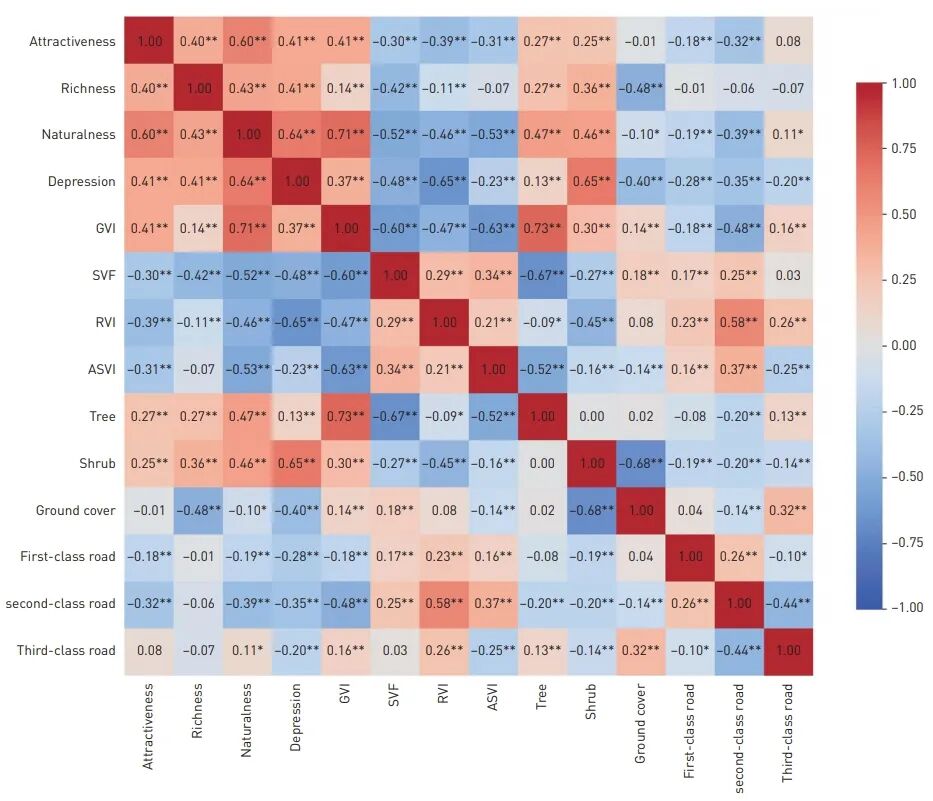Spearman相关性分析结果显示,自然程度与吸引力之间存在显著的正相关,表明自然程度高的场景更受人们的喜爱,与前人研究结果相符,即游客偏好自然植被丰富的环境,这可能会积极影响游客的公园使用频率和满意度。其次,丰富度与地被占比呈负相关关系,意味着地被的增加可能导致整体丰富度的降低。例如,珠江公园中以地被为主的区域(画面中地被占比较高),集中在公园西侧,且以开阔草坪为主,空间丰富度较低。自然程度与绿视率、乔木、灌木占比存在显著正相关趋势。其中,自然程度和绿视率分别反映了图像中主观和客观的生态环境状况,而主观自然程度的感知不仅受到植被占比的影响,还涉及其他影响因素,如绿色元素在图像中的整体构成比例、画面中呈现的其他材料(如水体、泥土、透水路面)等。