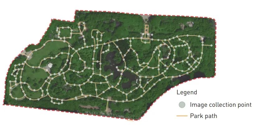 图像采集时间为2023年7月6日9:00~13:00,一位图像采集人员使用Insta360 ONE RS全景相机步行沿珠江公园所有道路进行拍摄,同时使用智能手持GPS传感器(佳明eTrex 221x)记录拍摄点位的位置信息,共采集到275个点位的全景图像。随后使用Insta360 Studio于平铺模式下截取0°和180°两个视角的照片共550张,以展示点位四周的场景环境。