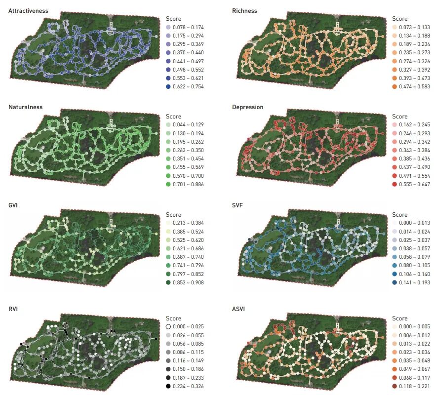 总体而言,本研究在以下三个方面展现出积极意义:1)采用的方法克服了传统视觉景观评估中难以高效评估大批量图像与多场景评估时易于出现的视觉疲劳问题,验证了基于图像大数据与深度学习技术的城市感知研究在绿地中应用的有效性。2)通过精准提取并评估客观指标与预测主观评分,发现植物与水体的存在有助于提升公园场景的吸引力与使用者的积极感知,而天空、道路与人工构筑物占比过高则会产生负面效果。3)采用的智能方法通过部分场景照片主观评分的学习,能够预测新场景的主观评分,帮助公园管理者高效识别出低分值区域,为城市绿地的更新设计提供指引,具有较强的实践应用价值。