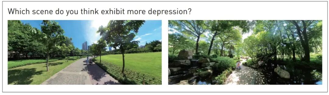 借鉴传统视觉景观评估研究,选取吸引力、丰富度、自然程度和压抑程度作为主观评价指标。其中,吸引力指公园场景对人们的吸引程度,包括景观的美观性、独特性等特征。丰富度指公园环境组成元素(包括物种与各类设计元素)的多样性和复杂性。自然程度指游客对公园环境在人为干预和自然状态之间平衡程度的感知,测定并理解公园的自然程度感知有助于制定公园维护管理策略。压抑程度指的是令人抑郁、沮丧、消沉的程度,压抑程度高的公园可能会让人感到不适,影响园内体验。