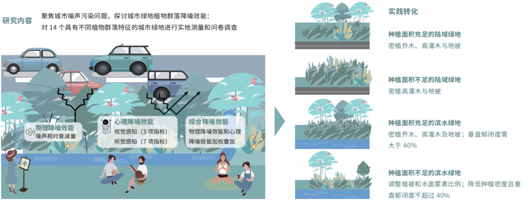 噪声污染严重影响人们的健康和生活质量,而城市绿地不仅美化环境,还起到降噪吸声的重要作用。本研究以上海苏州河滨水绿地植物群落为例,创新性地构建了基于物理与心理降噪效能的综合评估体系,共包括13项评价指标。