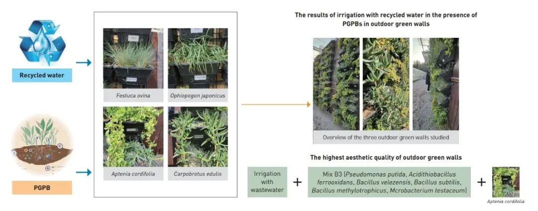 户外绿墙因其在提升建筑美学价值及促进健康、可持续的城市环境方面的优势而日益受到关注。然而,在全球水资源危机持续加剧的背景下,其高耗水问题引发了对应用替代水源(如再生水)的探讨。本研究探讨了植物生长促进细菌(PGPB)与再生水灌溉——三种灌溉水源(灰水、废水及城市用水)及不同细菌组合(Mix B1、Mix B2、Mix B3及对照组)——对伊朗马什哈德城市绿墙系统中四种植物生长及景观效果的影响,包括羊茅(Festuca ovina)、麦冬(Ophiopogon japonicus)、心叶日中花(Aptenia cordifolia)和莫邪菊(Carpobrotus edulis)。
