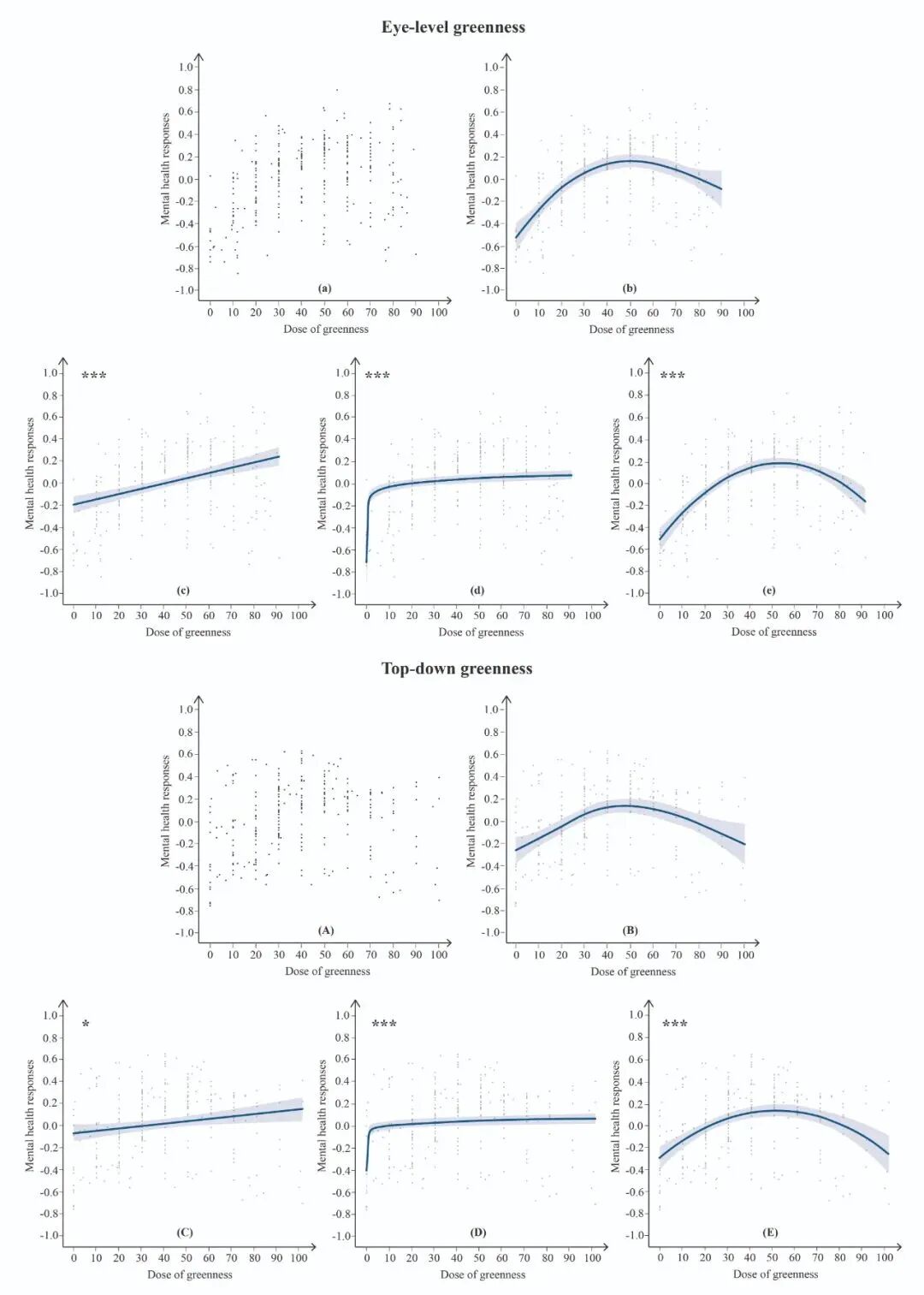 图2. 绿色剂量与心理健康表现之间曲线重拟合的荟萃分析。(a)-(e)显示视线水平绿色的结果;(A)-(E)显示俯视绿色的结果。(a, A)显示所有标准化收集点的散点图结果;(b, B)为非参数广义加性模型(GAM)曲线重拟合;(c)-(e)显示三种参数模型的结果。GAM模型和三种模型的比较均表明,由二次方程描述的倒U型曲线最适合绿色度(详见表1中的统计信息)。数据点以圆点表示,拟合曲线显示为深蓝色线,置信区间以阴影区域表示。统计显著性水平:***p< 0.001,**p< 0.01,*p<0.05,ns=不显著。