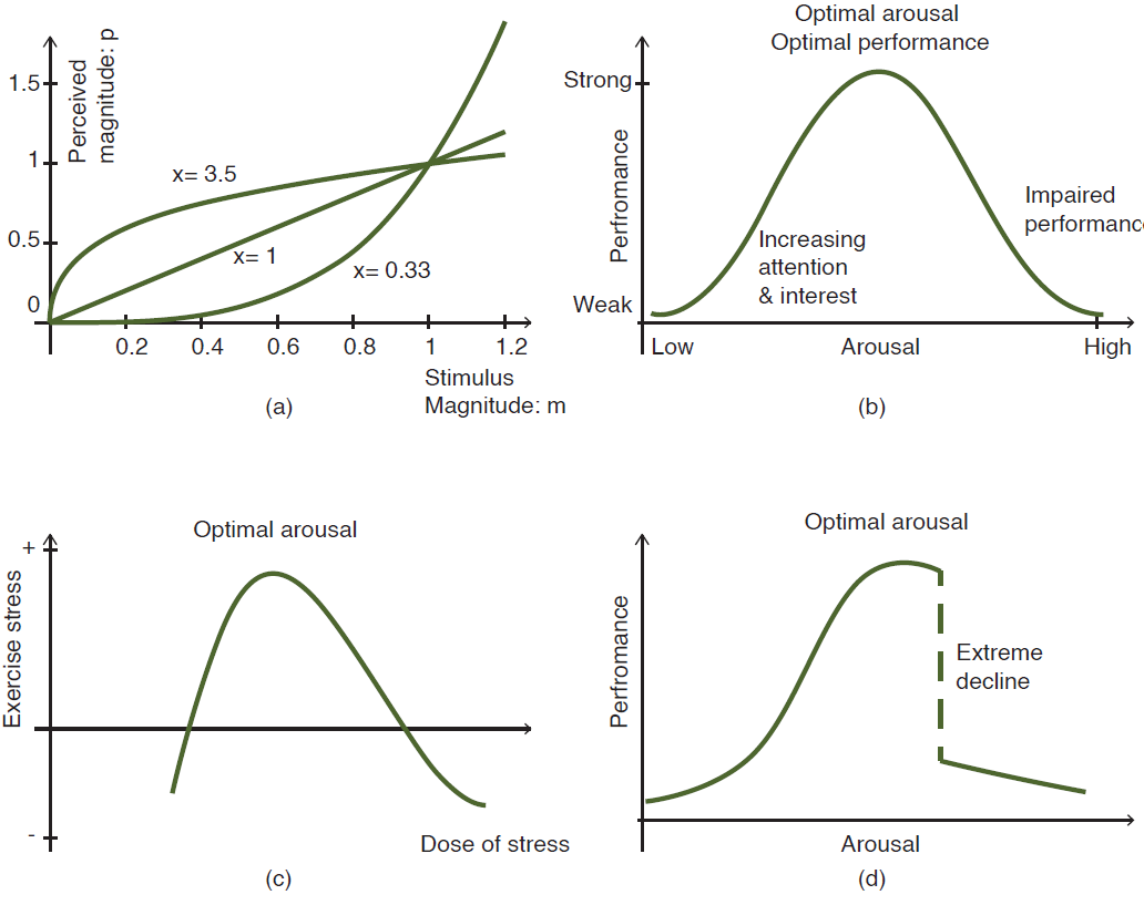 实现这一目标首先需要仔细检查相关理论模型,以识别剂量-反应曲线的可能模式,并理解这些模式背后的潜在因果机制。基于对外部刺激的生理和心理反应的四个理论模型,为我们探寻自然接触与心理健康的剂量反应曲线规律提供了有益的启示。它们表明可能识别出一般规律。四个理论模型包括(图1):史蒂文斯幂律(幂模式)(a)、耶克斯-多德森定律(倒U型模式)(b)、毒物兴奋效应理论(倒U型模式)(c)和突变模型(突变模式)(d)。
