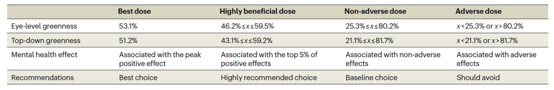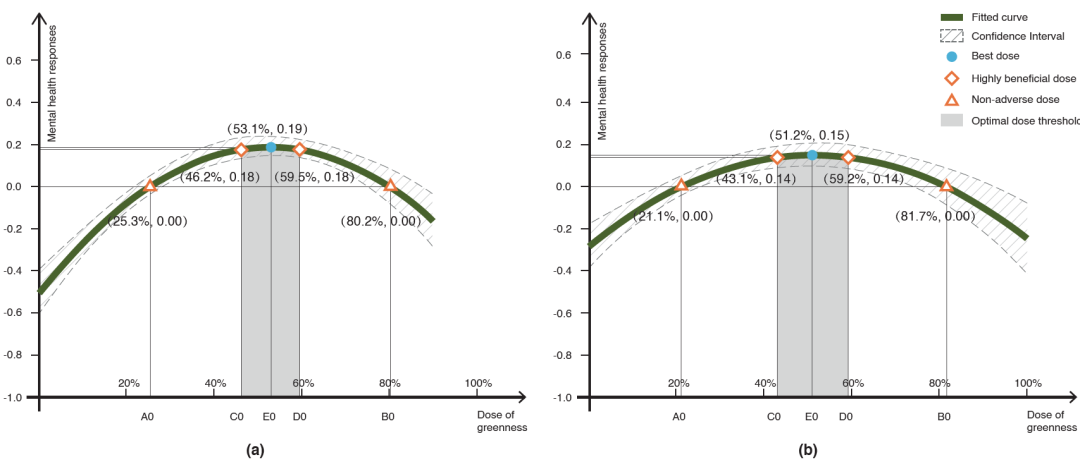 这些研究与我们的发现一致,并提供了支持我们假设的解释,即二次关系(倒U型曲线)可能最好地总结绿化剂量与心理健康反应之间的关系。当绿化达到某一点时,心理健康益处可能开始下降。与这一点相关的阈值可能被认为是高效益的绿化剂量。