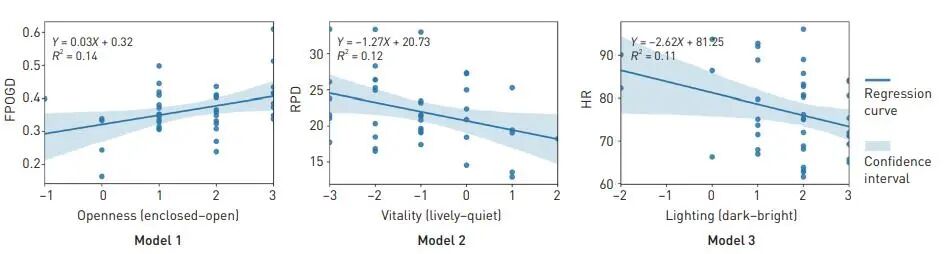 开敞度方面,模型1表明注视点持续时间与开敞度的感知存在正向关联,即开阔的街道环境能吸引更多的视线停留,表示宽敞空间可能增强人们的注意力和愉悦感。街道活力方面,模型2表明热闹感知越强(意味着街道上有更多的视觉兴趣区),瞳孔直径越大。光线方面,模型3显示光亮度感知越强,心率数值越低,表明光线明亮的街道环境可以增强受试者的积极情绪,使人们更加放松和冷静。