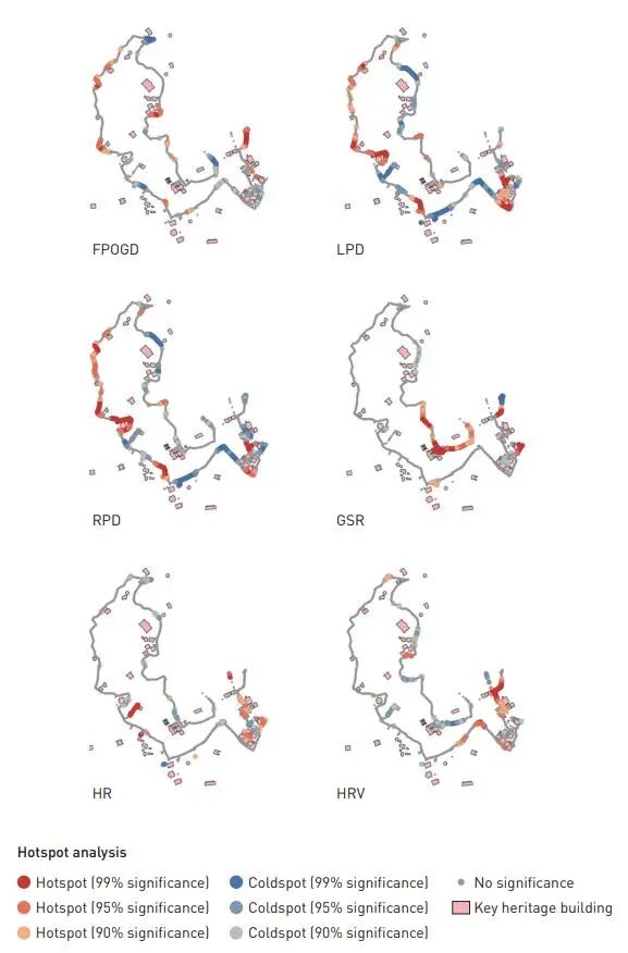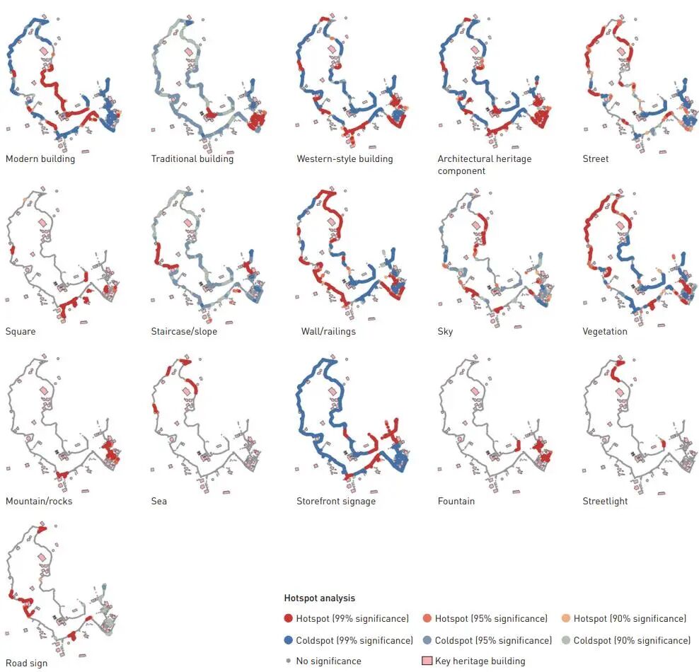 眼动数据空间热点分析图结果显示,建筑要素的高值区域主要集中在历史建筑较为集中的区域;道路要素的高值区集中在街道交汇处和边界明显的地方;自然要素的高值区则出现在海滩和公园等视野开阔的区域;而地标要素的高值区则多出现在商住型街道和空间节点。