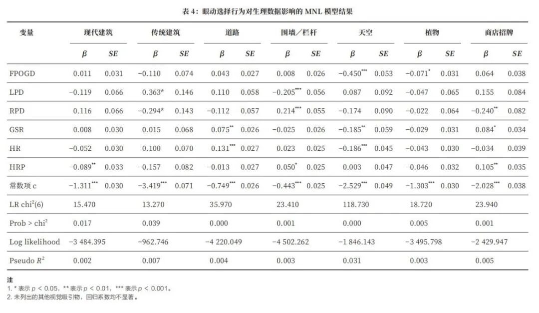 为了揭示心理感知与生理指标之间的关系,研究通过MNL模型来量化不同视觉吸引物对生理数据的影响程度。结果显示,仅现代建筑、传统建筑、道路、围墙/栏杆、天空、植物和商店招牌7项视觉吸引物与生理指标之间具有显著关联(表4)。