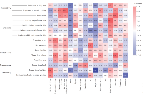 空间特征指标与视觉吸引物相关性分析结果(*表示在0.05的水平上显示显著相关性,**表示在0.01的水平上显示显著相关性,***表示在0.001的水平上显示显著相关性) © 郭晶,李渊