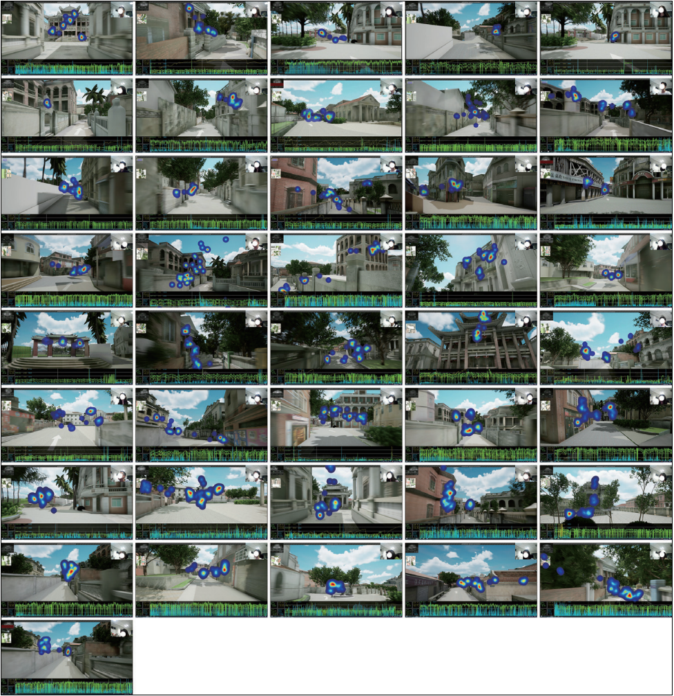 第二步,参考以视频和虚拟漫游场景作为刺激材料的相关研究,以10s为单位,对眼动和生理传感数据进行切片分析,记录空间坐标变化,同时标注对应的眼动热区和生理指标变化。