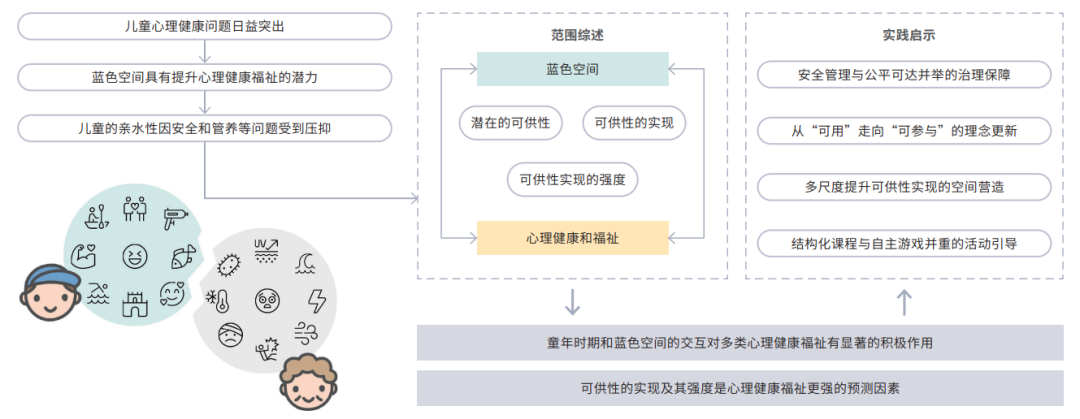 蓝色空间因其对儿童的强烈吸引力,被认为在促进儿童心理健康福祉方面具有重要作用。然而,当前已有研究较为零散,缺乏系统梳理。本文采用《系统综述和荟萃分析优先报告的范围综述扩展指南:清单与解释》范围综述方法,从Web of Science、Scopus、PsycINFO、MEDLINE等数据库筛选并分析了符合纳入标准的21篇文献。基于可供性理论,本文首先梳理了童年时期与蓝色空间交互对心理健康福祉的影响,进而探讨了可供性的实现及其强度是否影响以及如何影响这一作用过程。
