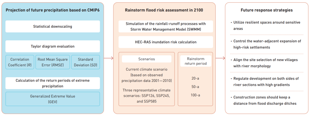 气候变化导致极端气象事件的强度和频度显著提升,对大量山区乡村聚落的水文生态安全造成了较大挑战,因此亟需对未来气候情景下的山区村庄雨洪风险预测开展研究。本研究以北京市永定河流域的山区为例,利用CMIP6数据和Delta统计降尺度方法,对本世纪末SSP126、SSP245、SSP585情景下,重现期为20、50、100年的降雨事件进行预测,并采用SWMM耦合HEC-RAS二维水动力模型,对永定河河道两侧村庄聚落进行淹没模拟。