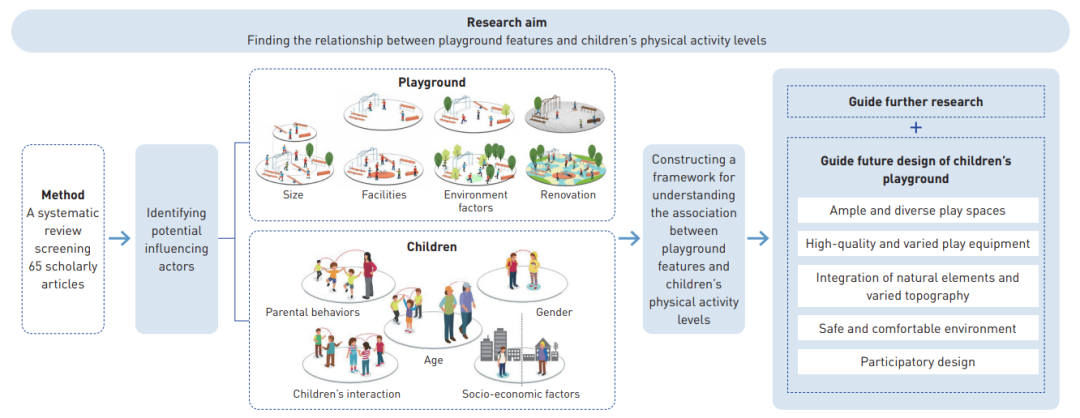 体力活动对儿童的健康发展至关重要;然而,由于久坐行为的增加,许多儿童未能达到建议的活动水平。活动场地对于促进儿童体力活动而言尤为关键。尽管如此,活动场地特征与儿童体力活动之间的复杂关系尚未被完全阐明。本综述全面分析了65篇文献,探讨了活动场地中影响儿童参与体力活动的多方面因素。这些因素包括活动场地大小、设施、环境因素及翻新改造等自变量,以及年龄、性别、儿童互动、家长行为及社会经济因素等调节变量。尽管该领域已积累了广泛研究,但研究结果仍较零散,甚至在关于更大的活动场地和自然元素能否增强儿童的体力活动、男孩和女孩对设施的偏好差异等方面存在矛盾。本综述提出了一个包含一系列影响儿童体力活动水平的活动场地特征(即关键变量)的综合框架。此框架可增进对活动场地特征如何影响儿童活动水平的理解,同时为未来在设计和公共卫生领域的规划设计提供科学支撑。