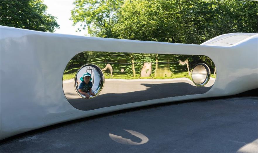 为了实现各种功能需要,该装置被分解成三个区域,并重新定义了其周围环境。装置一边一面完整的镜子,反射了周围的绿色。走近看,儿童游乐的身躯和路人的身影在镜面的映射下变得扭曲而有趣。设计在装置的第二个内凹处,置入了一个巨大的蹦床。第三个内凹处的球门,作为儿童游乐场的延展部分。而在装置末尾处的翘起部分,设计师加入了一个摇摆部件。装置最终创建了一个全方位的游戏空间,使孩子们可以在其四周及内部等各个地方玩耍。